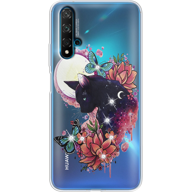 Чехол со стразами Huawei Nova 5T Cat in Flowers