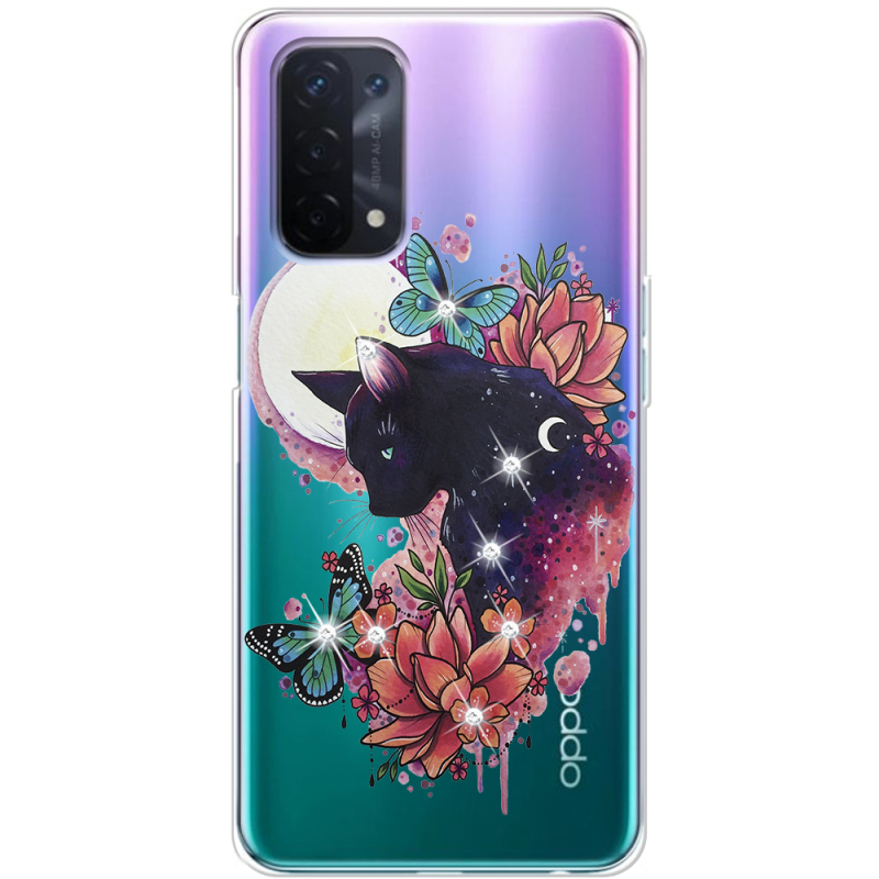 Чехол со стразами OPPO A74 5G Cat in Flowers