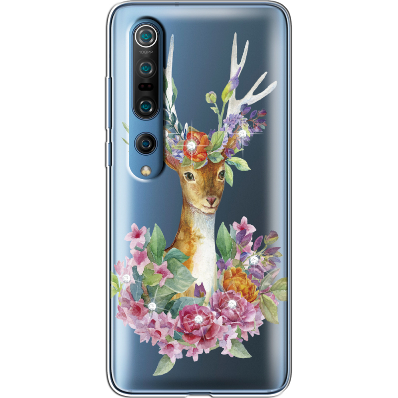 Чехол со стразами Xiaomi Mi 10 Pro Deer with flowers