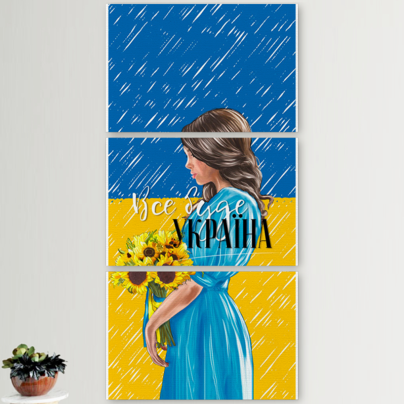 Модульные картины горизонтальные 60 на 40 3шт Україна дівчина з букетом